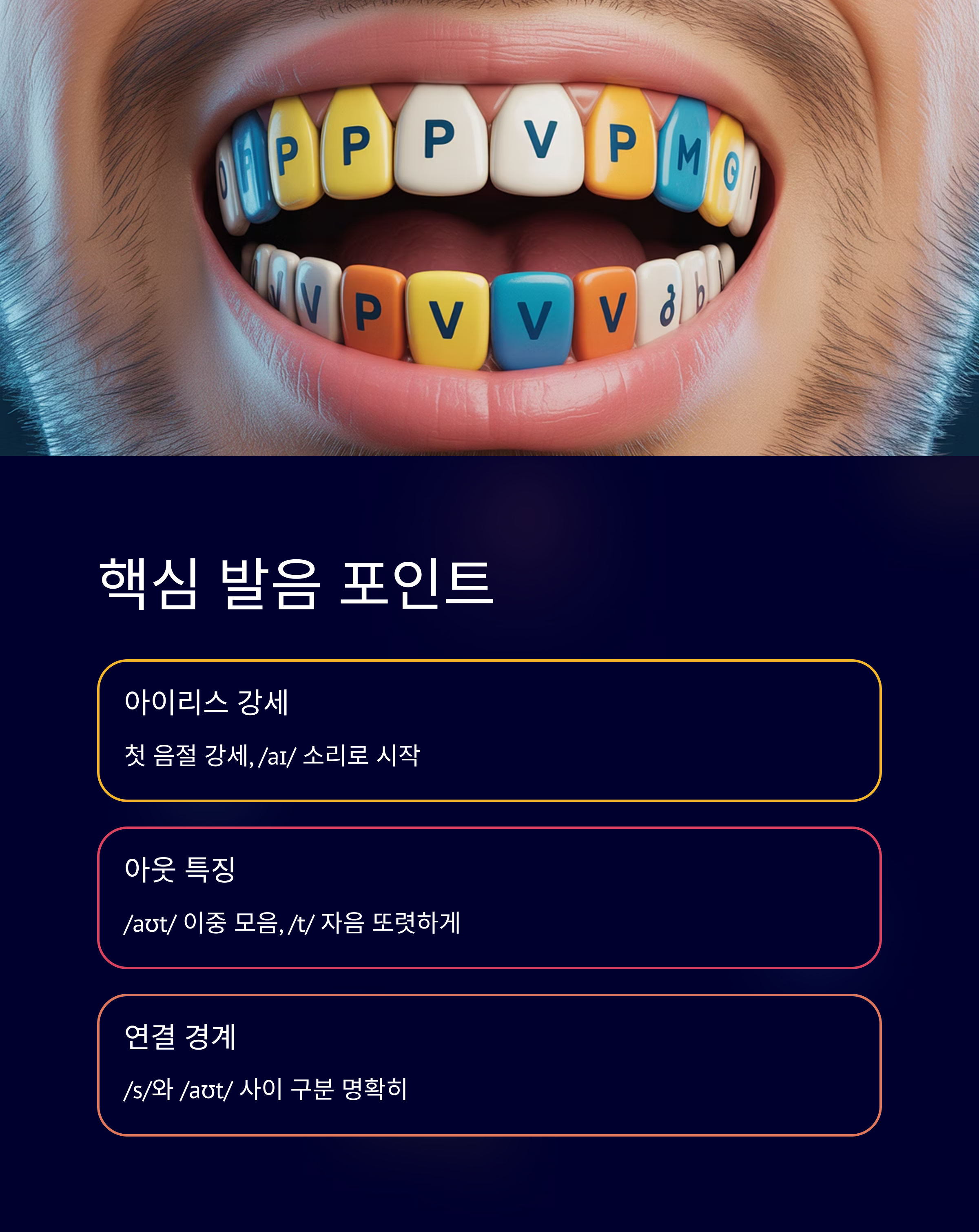 - 사례 3: 길게 늘려 들리는 오해를 피하려면, 두 단어의 경계를 명확히 하여 /ˈaɪrɪs/와 /aʊt/를 각각 선명하게 들려주어야 합니다.