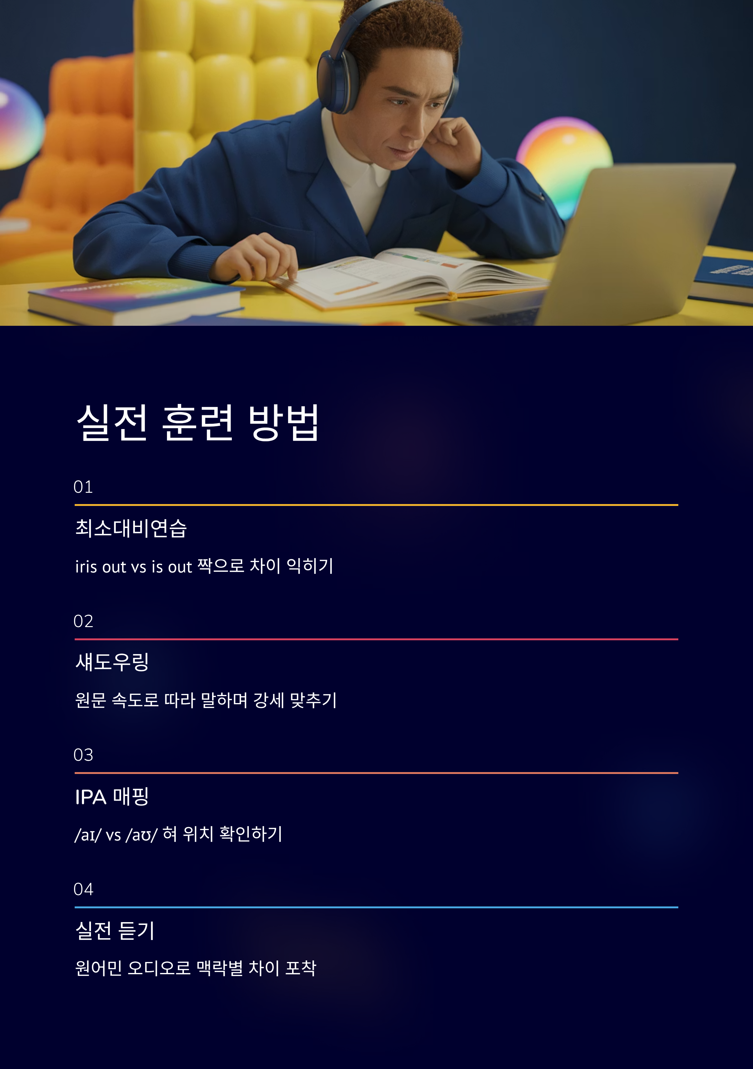 아이리스 아웃 발음은 두 단어의 모음·자음 구분과 강세 인지가 핵심입니다. 본 글의 포인트와 표를 바탕으로 오늘 바로 최소대비연습과 섀도우링을 시작해 보세요.