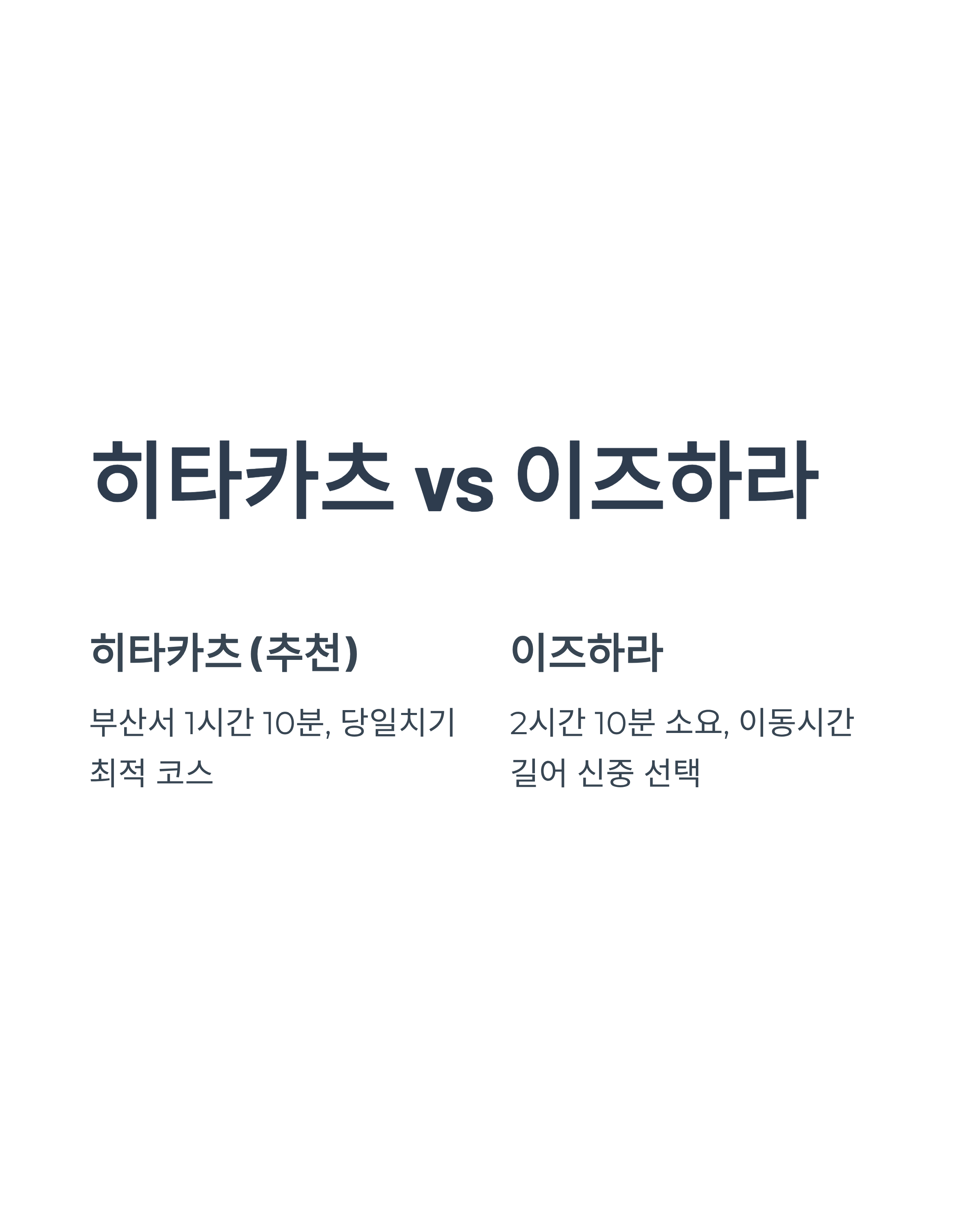 * 히타카츠: 짧은 시간 안에 알찬 여행을 즐기려면, 히타카츠 주변 명소를 집중적으로 공략하는 것이 좋습니다. 미우다 해변, 한국전망대, 히타카츠 시내 등을 둘러보는 코스가 일반적입니다.