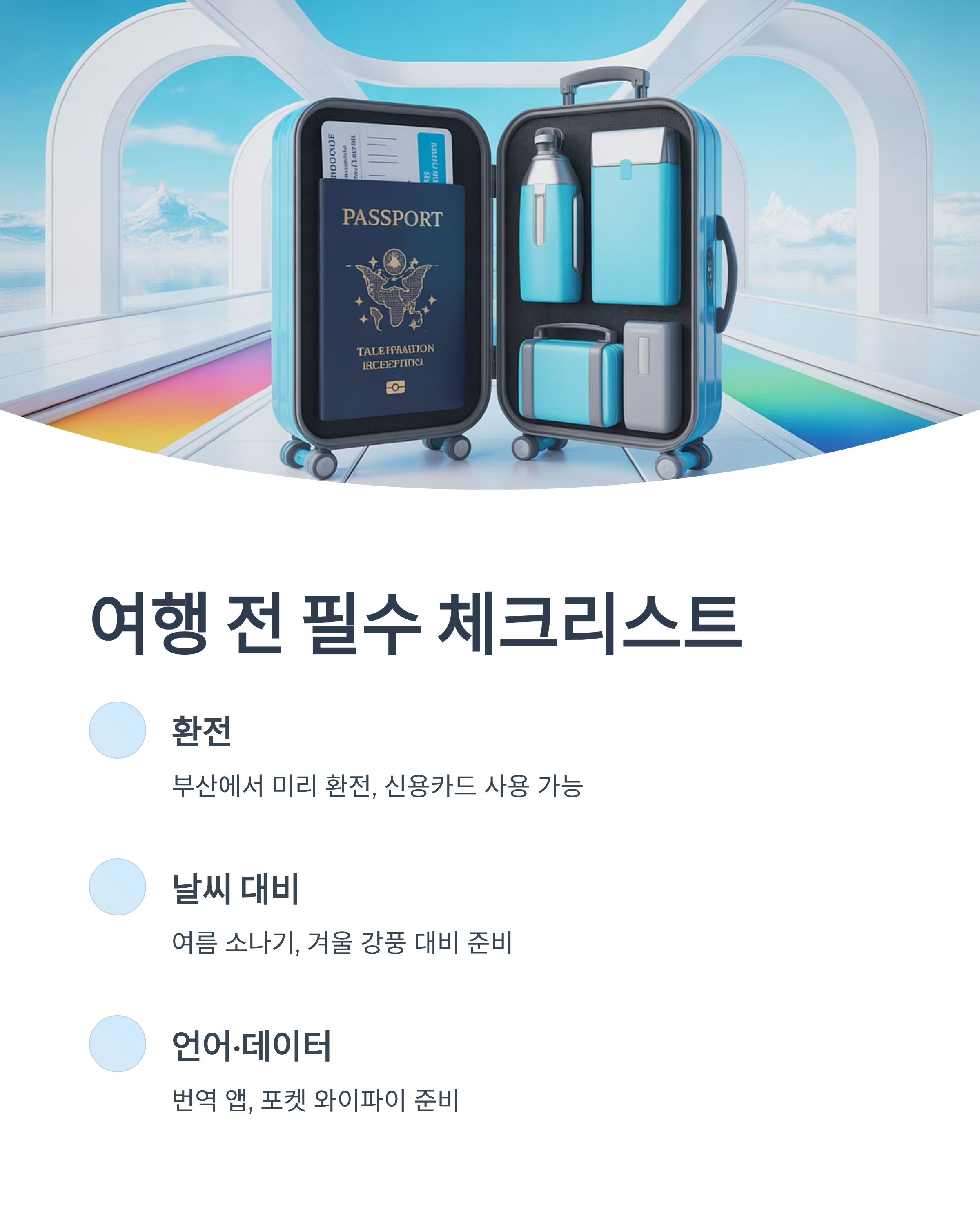 * 사고: 해외여행 중에는 예상치 못한 사고가 발생할 수 있습니다. 여행자 보험에 가입하고, 비상 연락망을 미리 준비해 두는 것이 좋습니다. 예를 들어, 렌터카 사고 시 보험 적용 범위, 현지 경찰 연락처 등을 미리 알아두면 당황하지 않고 대처할 수 있습니다.
